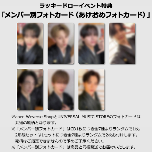 aoen Weverse ShopまたはUNIVERSAL MUSIC STOREにて、下記期間内にラッキードローイベント対象商品をご予約・ご購入のお客様に先着で、CD1枚につきラッキードローイベント限定絵柄「メンバー別フォトカード(あけおめフォトカード)」を全7種のうちランダムで1枚プレゼントいたします。