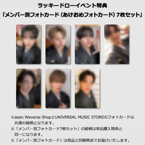 aoen Weverse ShopまたはUNIVERSAL MUSIC STOREにて、下記期間内にラッキードローイベント対象商品をご予約・ご購入のお客様に先着で、CD1枚につきラッキードローイベント限定絵柄「メンバー別フォトカード(あけおめフォトカード)」を全7種のうちランダムで1枚プレゼントいたします。