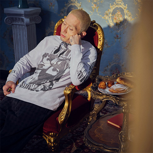 唇は動かさず、腰だけを振る。エグザイル・オン・メインストリートのコラージュ・グラフィックを白のロングスリーブにプリント。