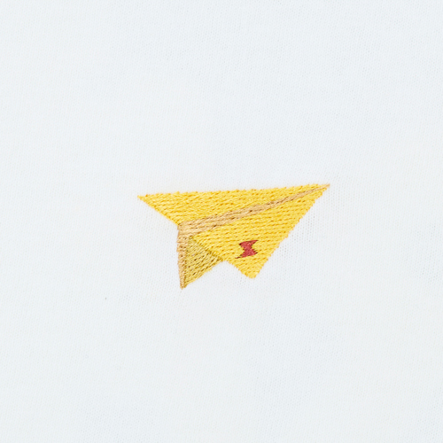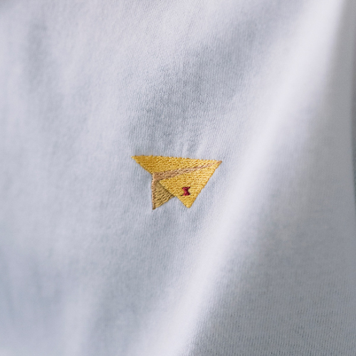 象徴的なジャンプシーンをバックに、フロントには紙飛行機のワンポイントをあしらいました。
