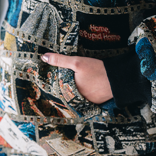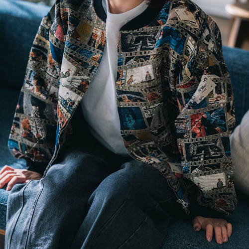 7thアルバム「STARRING」特報映像の印象的なシーンを映画のフィルムのように繋いだデザインで、まさにアルバムテーマ「映画」の世界観を表現したアウター。横糸だけで絵柄を表現する「綴織(つづれおり)」技法で作られたこだわりの1枚です。