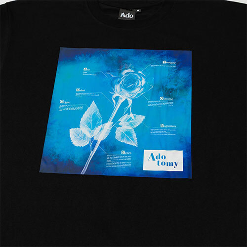 Adotomy=Ado+解剖というテーマから、Adoの象徴である”青い薔薇”の解剖をイメージしたデザインです。グラフィック内にはAdoにまつわるテキストをデザインとして散りばめています。