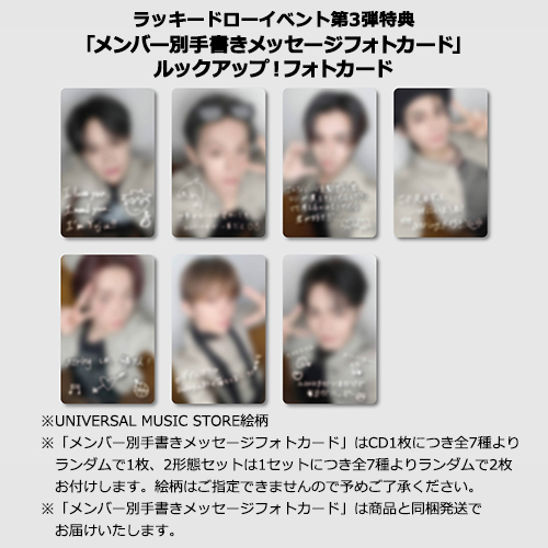 ・セット商品をご購入の場合は枚数分に応じたラッキードロー限定絵柄「メンバー別手書きメッセージフォトカード」をプレゼントいたします(2形態セット購入で2枚、7形態セットで7枚)。